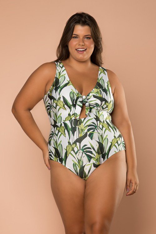 body maio com decote transpassado com bojo removível e lacinho nas costas e estampa de fundo verde e folhas brancas e249
