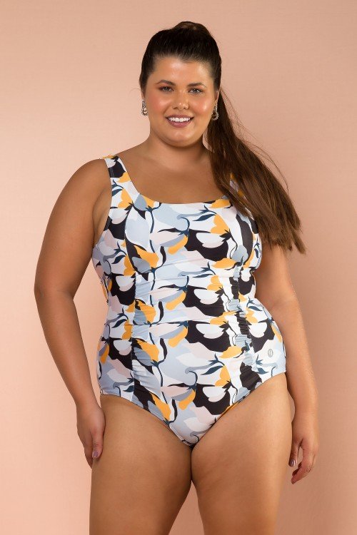body maiô sublimado com bojo removível e detalhe em argolas e estampa de fundo verde e folhas coloridas e244