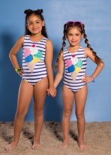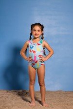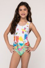 body maiô sublimado com bojo removível com decote e detalhe em argola estampa de folhas verdes e flores e bolinha branca e108