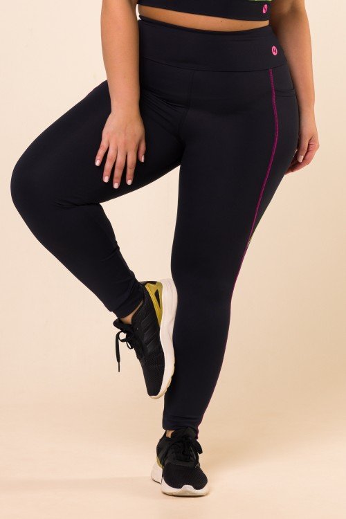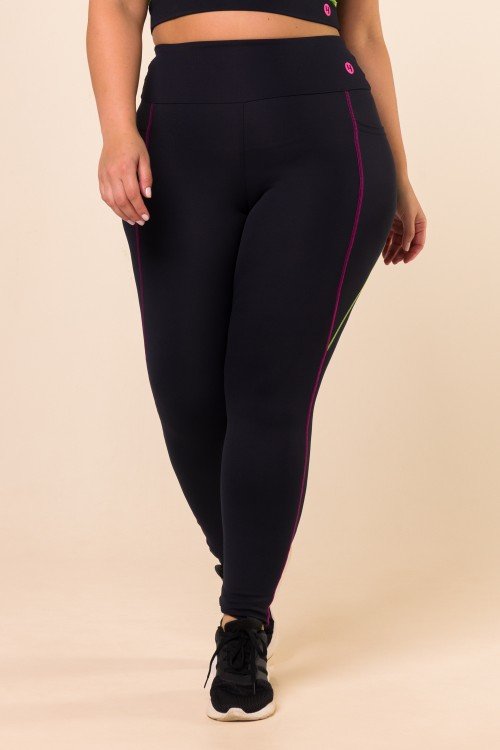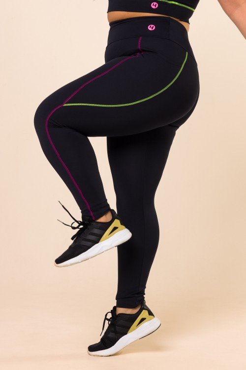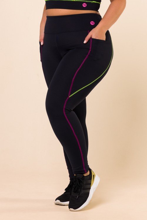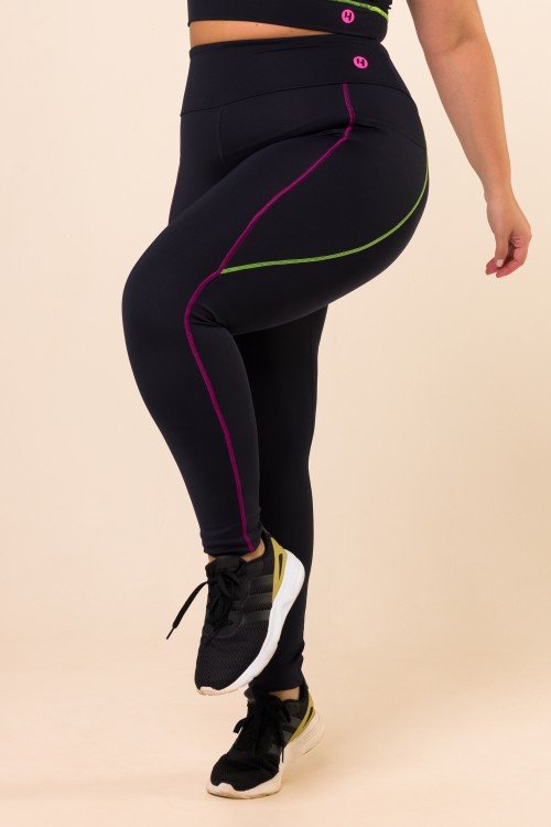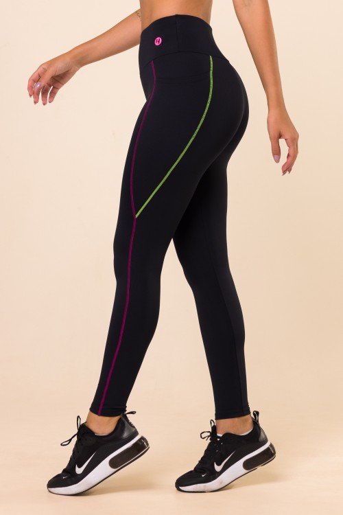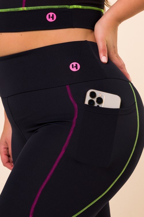 • Calça Legging Preta Com Bolso e Pesponto Colorido