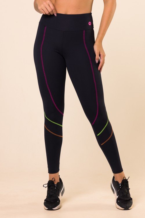 • Calça Legging Preta Com Recortes e Pesponto Colorido