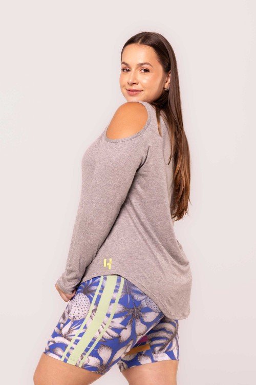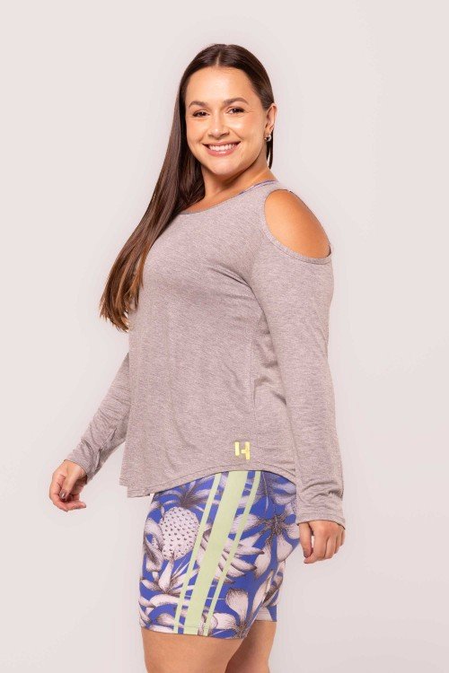 Blusa Viscose Manga Longa Detalhe no Ombro Cinza Mescla