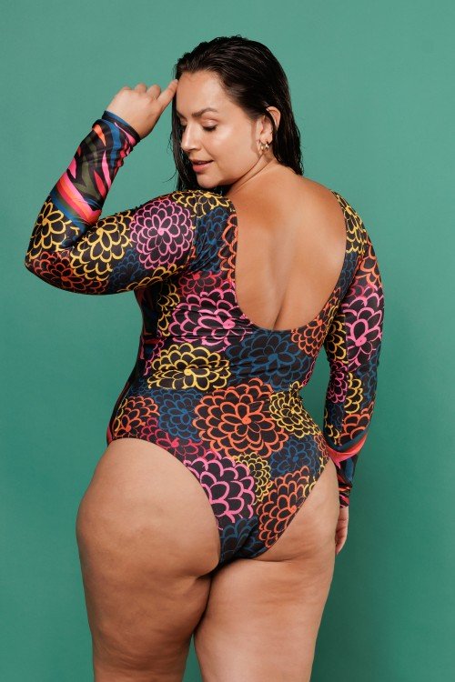 body maiô sublimado com bojo removível com detalhe em argola e abertura na frente com estampa de fundo verde e folhas coloridas e244