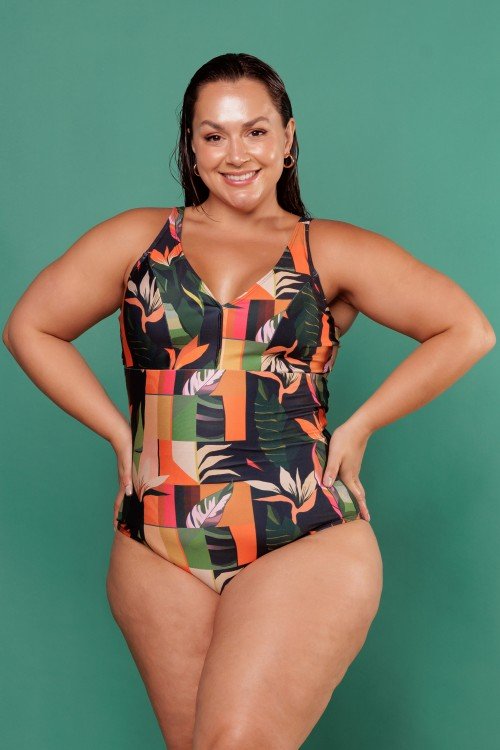 Body Maiô Sublimado Com Bojo Removível Com Detalhe Em Argola E Abertura Na Frente Com Estampa De Fundo Verde E Folhas Coloridas E244