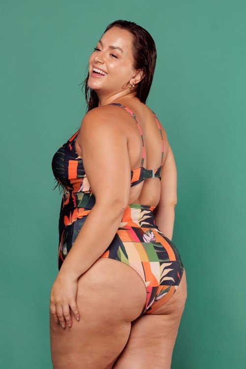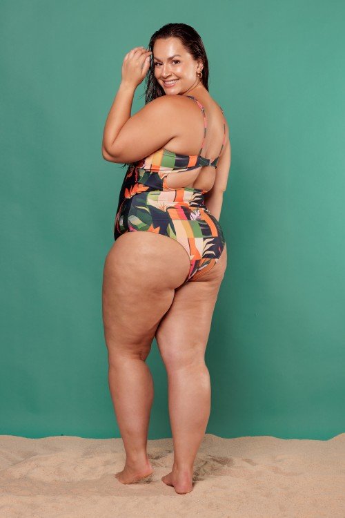 body maiô sublimado com bojo removível com detalhe em argola e abertura na frente com estampa de fundo verde e folhas coloridas e244