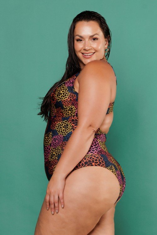 body maiô sublimado com bojo removível e detalhe em argolas e estampa de fundo branco e folhas coloridas e243