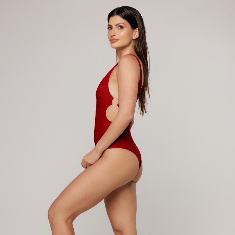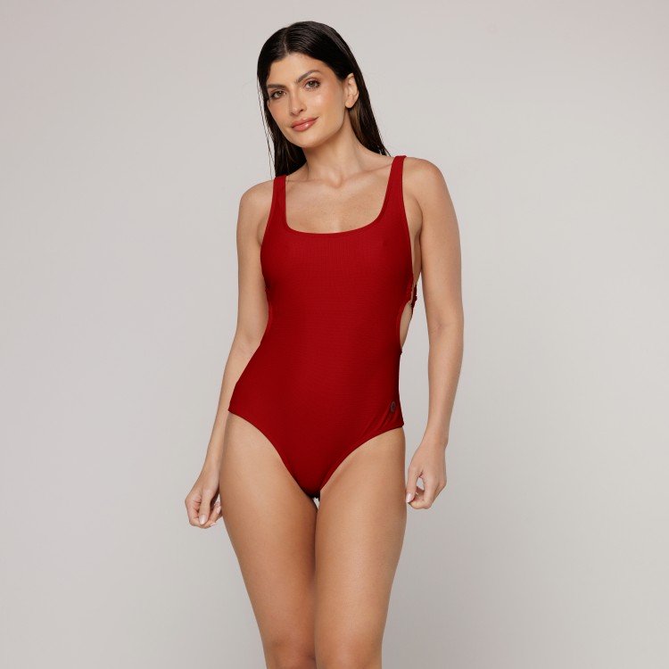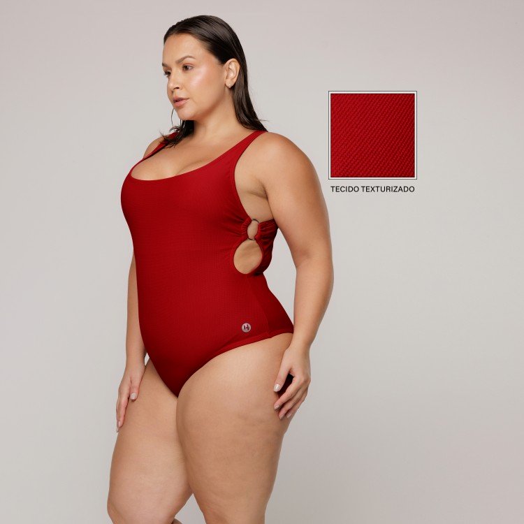body maiô sublimado com bojo removível com detalhe em argola e abertura na frente com estampa de fundo branco e folhas em tons de verde e256