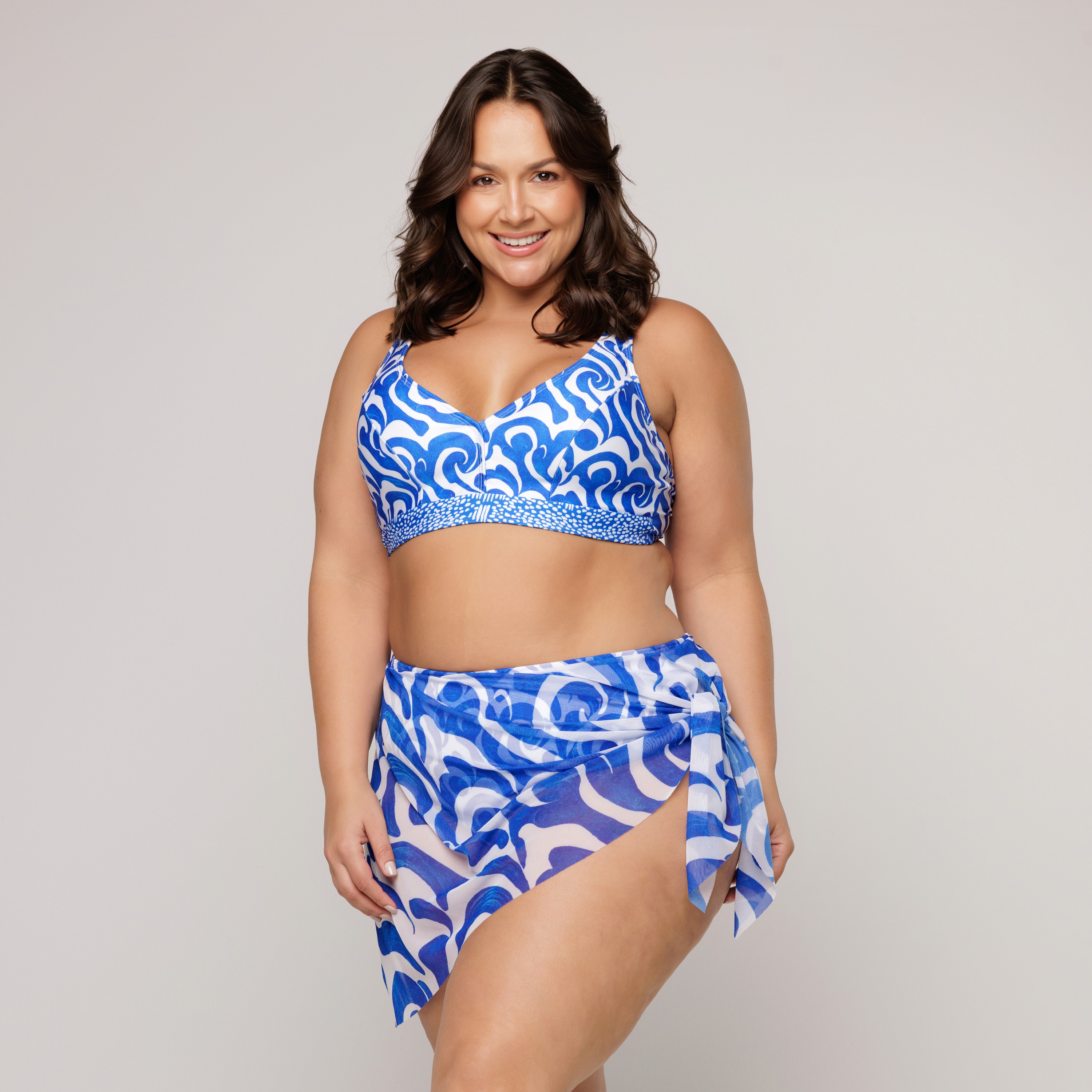 A novidade é que essa calcinha de biquíni vem com uma sainha de tule embutida, tecido que seca rapidamente e pode-se usar a saia solta ou amarrada. Um biquíni que combina estilo e funcionalidade para curtir tranquilamente seu dia na praia ou na piscina.