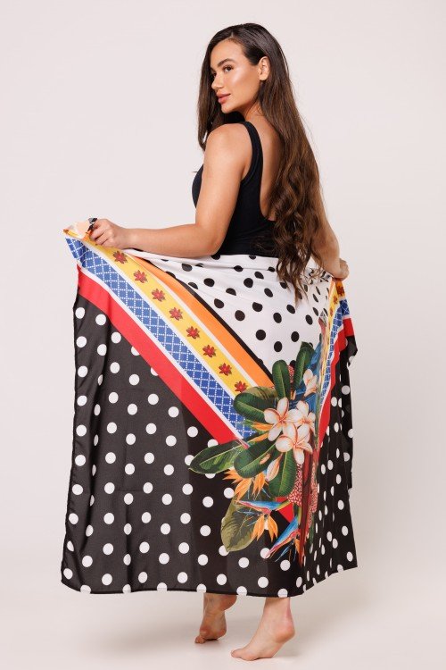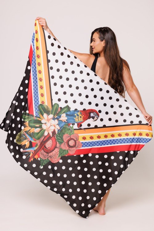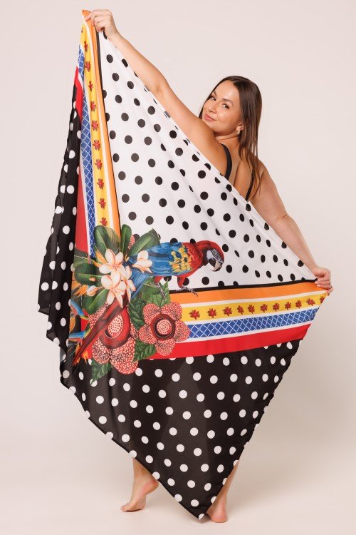 • Canga Pareô Estampa Bolinhas Preta E Branca + Flores E Arara E185