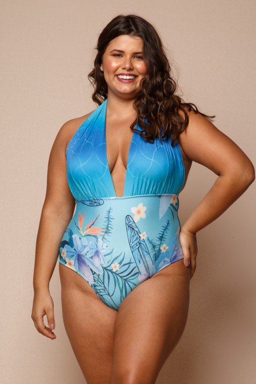 body maiô sublimado com bojo removível com detalhe em argola e abertura na frente com estampa de fundo branco e folhas em tons de verde e256